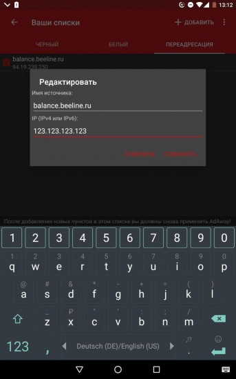Я использую программу Adaway (ссылка будет в конце статьи). В этой программе можно удобно добавлять свои перенаправления в файл hosts. Переходим в меню - ваши списки - перенаправления и указываем в первой строке адрес, а во второй ip proxy сервера. Далее возвращаемся на главный экран и применяем изменения. Если нет интернета, то уберите галочки со списков с блокировкой рекламы, иначе изменения не получится применить, так как списки не смогут сформироваться.