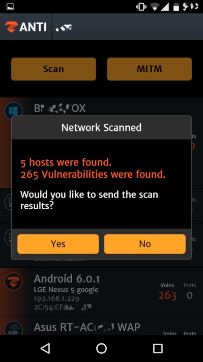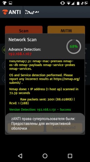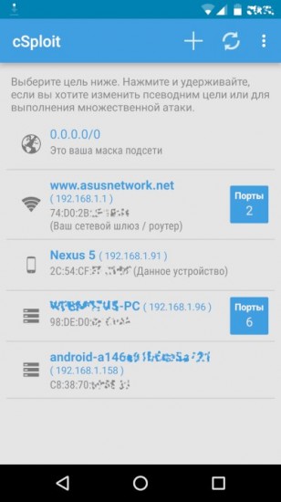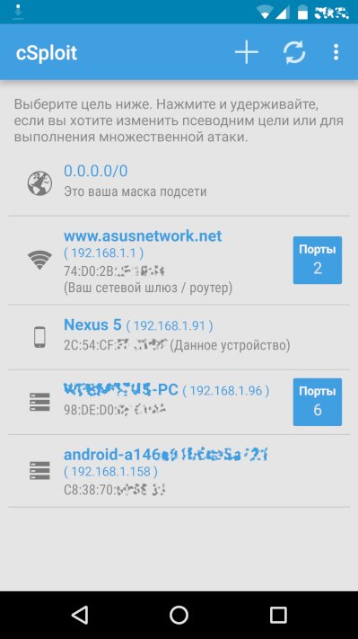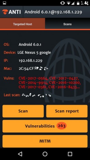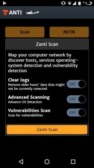 Интерфейс zAnti разделен на две части: сканирование и MITM. В первой секции он, подобно dSploit и оригинальному cSploit, мапит сеть, определяет все хосты, их параметры и уязвимости.