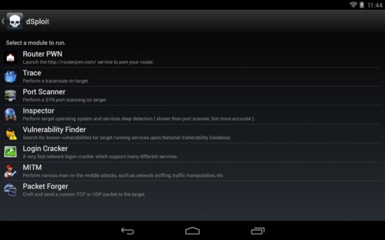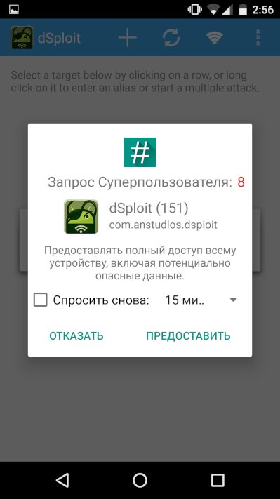 Форк cSploit от Симоне Маргарителли (Simone Margaritelli), приказавший долго жить в 2014 году. Проект так и остался в стадии бета-версии с очень сырым кодом. Если cSpoit у меня работал без нареканий, то последние три версии dSploit вываливались с ошибкой почти сразу после запуска.