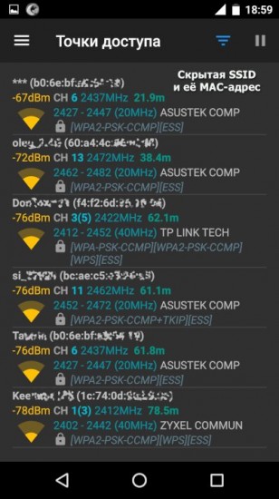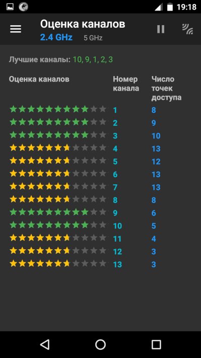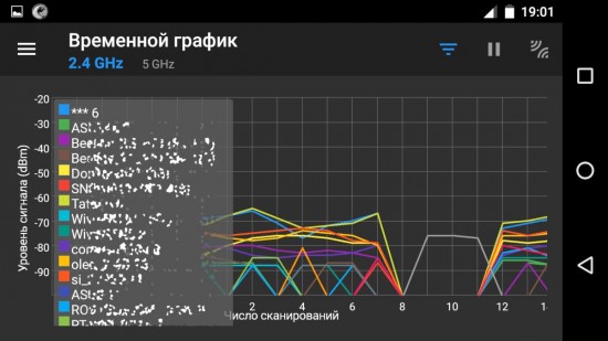 WiFiAnalyzer позволяет наглядно увидеть ситуацию в эфире, отфильтровать цели по уровню сигнала, SSID, используемой частоте (2,4/5 ГГц) и типу шифрования. Также вручную можно определить наименее зашумленный канал по графикам двух типов: обычному и с временным накоплением.