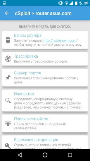 cSploit содержит инструмент для создания и отправки на выбранный хост любого TCP/UDP-пакета. По ссылке взлом роутера перенаправляет на онлайн-сервис для выбора и эксплуатации уязвимостей под определенную модель. База перестала обновляться в 2015 году, но все еще сохраняет актуальность. В моем кратком тесте на роутере ASUS, который выпускается с конца 2016 года, в свежей прошивке (апрель 2018 года) была обнаружена уязвимость, впервые описанная в 2009 году.