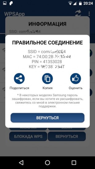 Если пользователь не сменил дефолтный пин и не отключил WPS, то утилита самое большое за пять минут перебирает все известные значения и получает WPA(2)-PSK, каким бы длинным и сложным он ни был. Пароль от беспроводной сети отображается на экране и автоматически сохраняется в настройках Wi-Fi смартфона.