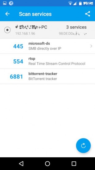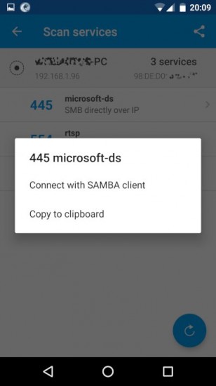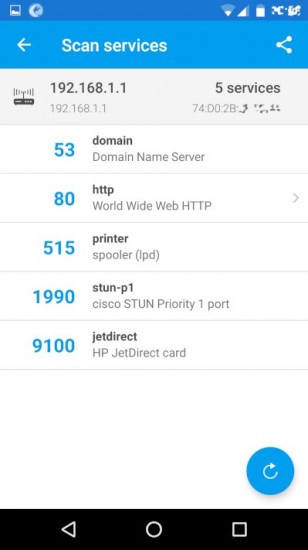 Fing автоматически определяет открытые порты и сопоставленные им сервисы. При обнаружении SMB, SSH, FTP и прочего Fing предлагает подключиться к ним, вызывая для этого внешние программы из своего меню. Если соответствующая утилита (например, AndSMB) не установлена, то Fing открывает ссылку на ее загрузку.
