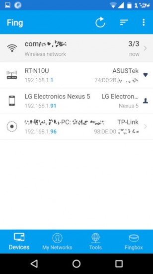 Fing выполняет расширенный анализ имен NetBIOS, UPNP и Bonjour, поэтому точнее определяет типы устройств и показывает больше их свойств. В Fing интегрированы утилиты ping и tracerout. Также он умеет отправлять запросы WOL (Wake on LAN), удаленно пробуждая «спящие» устройства, поддерживающие эту функцию.